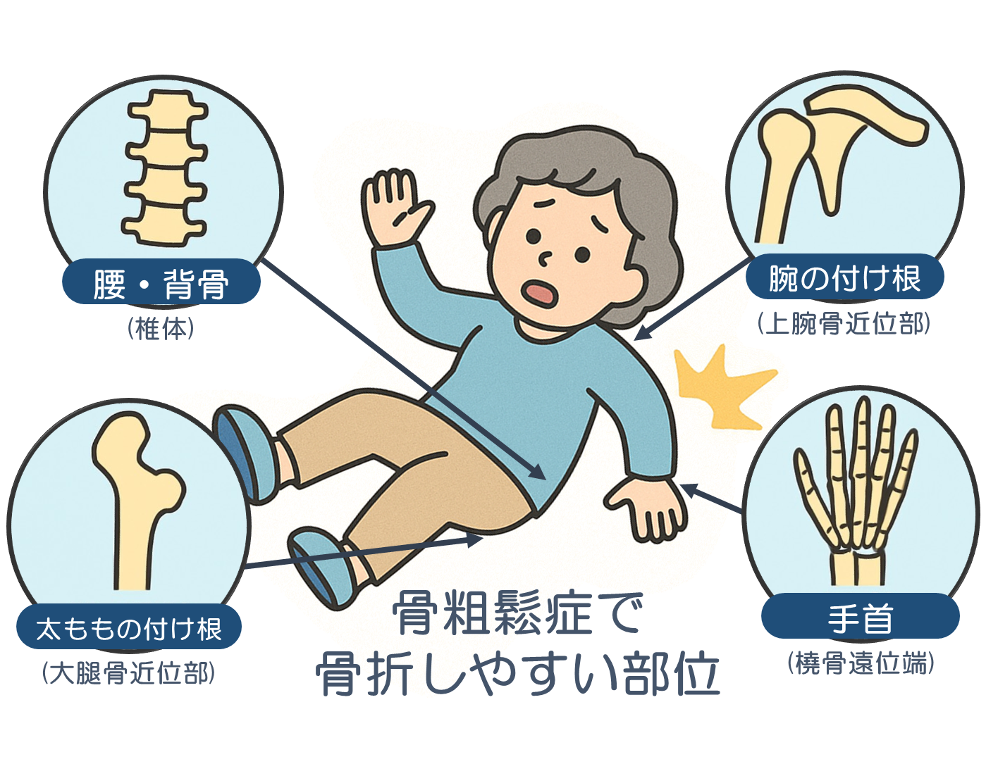 骨粗鬆症とは、骨の強度が低下してもろくなり骨折しやすくなる病気です。骨粗鬆症は自覚症状がほとんどありませんが、問題となるのは脆弱性骨折です。脆弱性骨折は、立った状態からの転倒など、わずかな衝撃でも生じる骨折のことです。特に太ももの付け根や腰の骨折では、手術や長期間のリハビリが必要になることがあります。また、寝たきりになった場合は、介護が必要となり、健康寿命が短くなるといわれています。