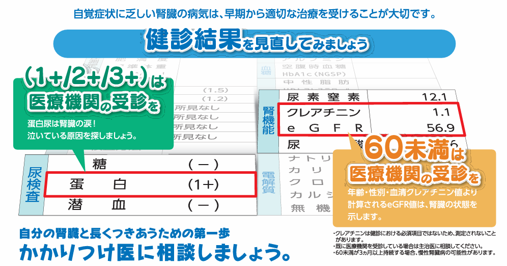 発見が早期であれば改善が期待できることもありますが、腎機能がある程度まで低下すると元に戻らないといわれています。早期発見のためには、健診や診察での定期的な尿検査・血液検査が重要です。