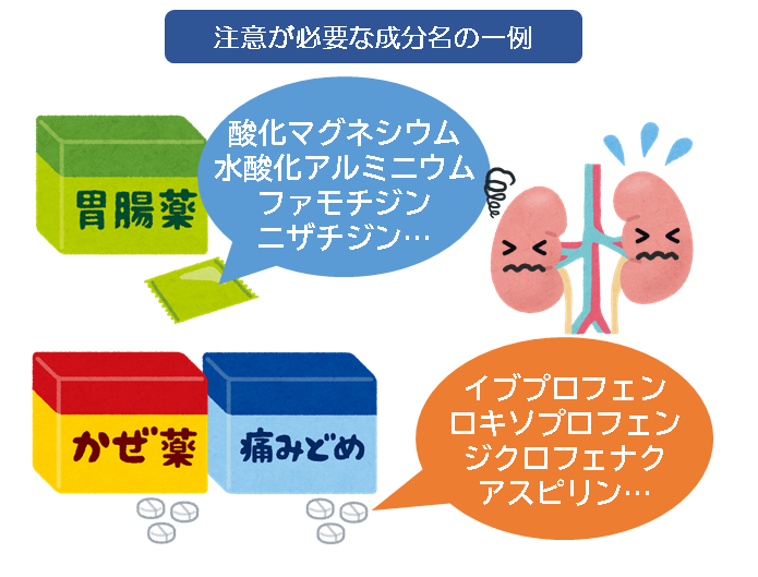 CKDの方が市販薬の風邪薬(総合感冒薬)や解熱鎮痛薬、下剤や制酸剤(胃粘膜を保護する薬)、胃腸薬(H2ブロッカー)を使用する場合は注意が必要です。また、カルシウムやビタミンDを含むサプリメントや健康食品も同様に注意が必要です。